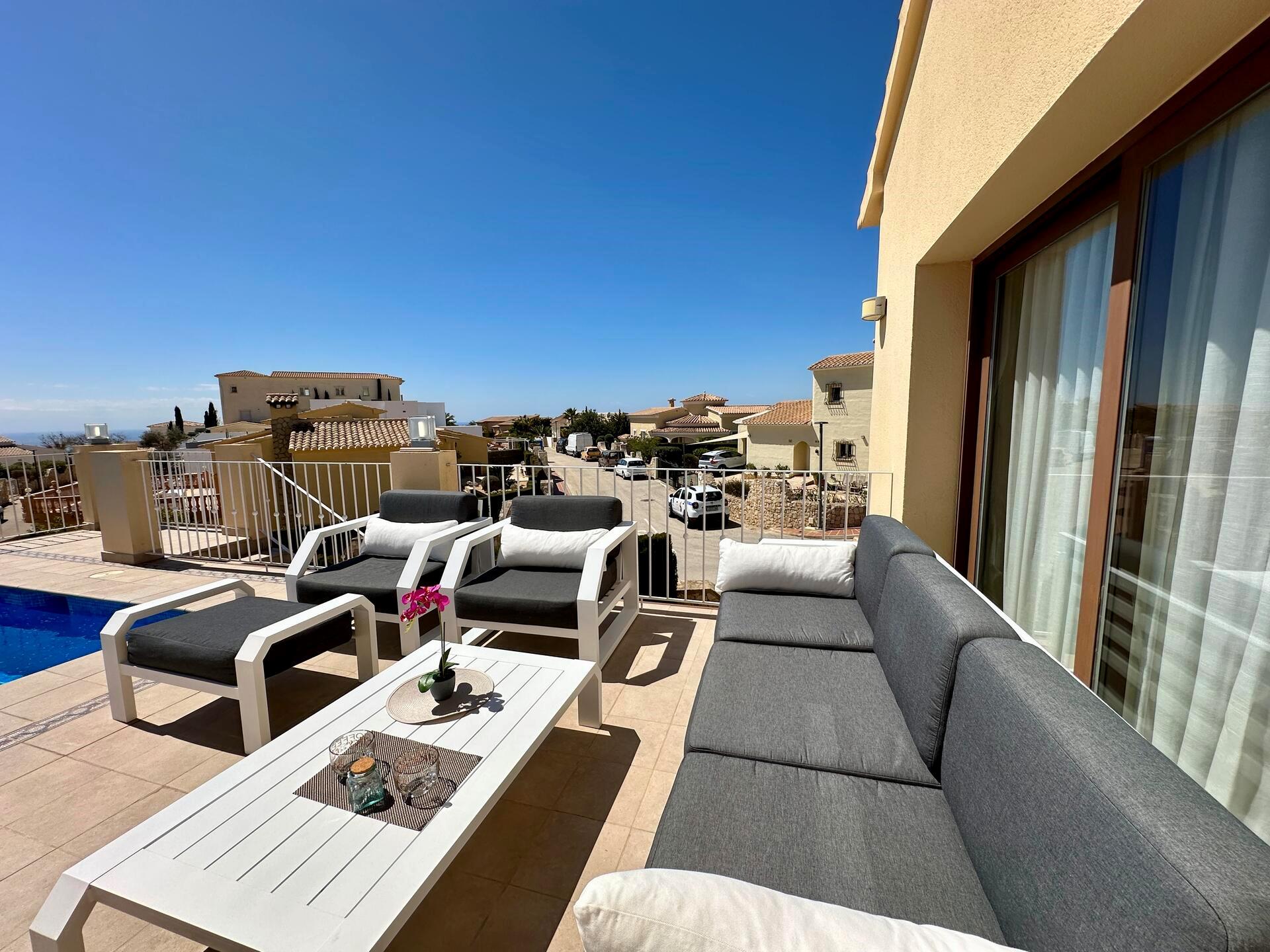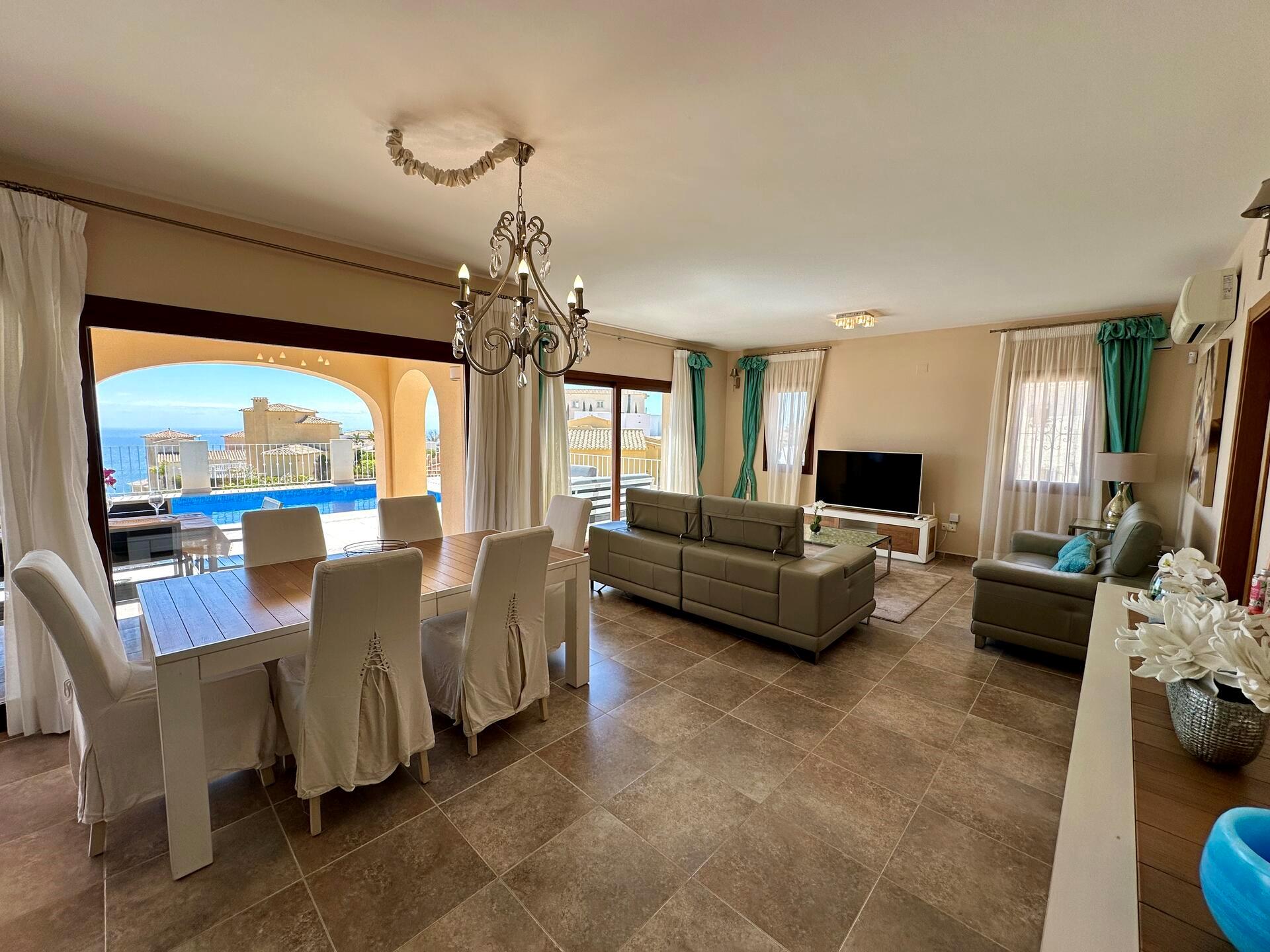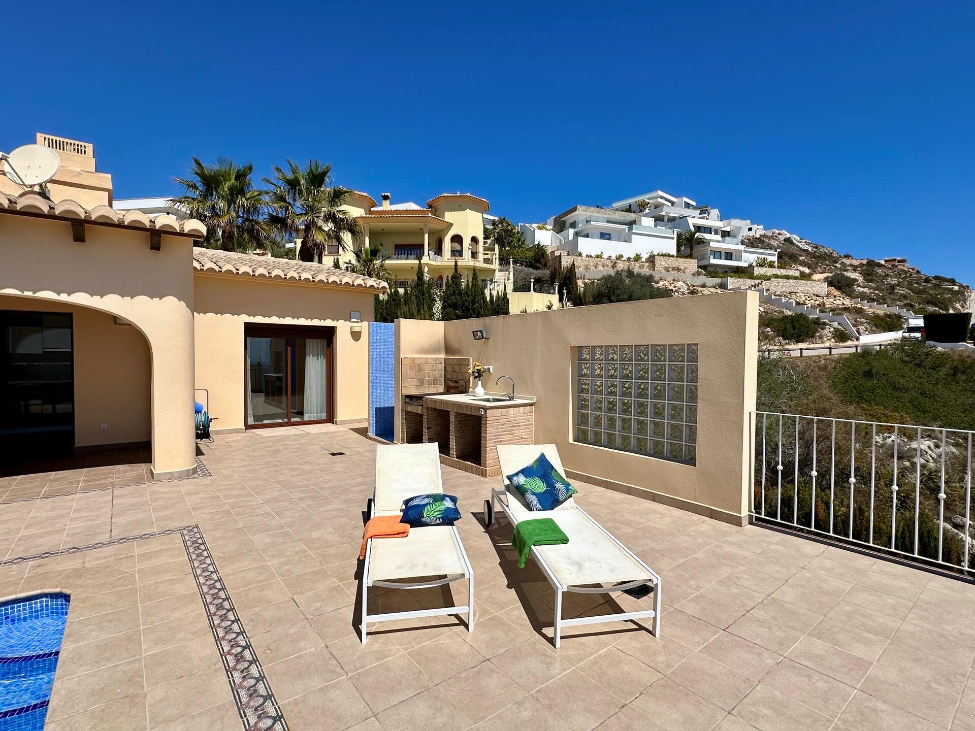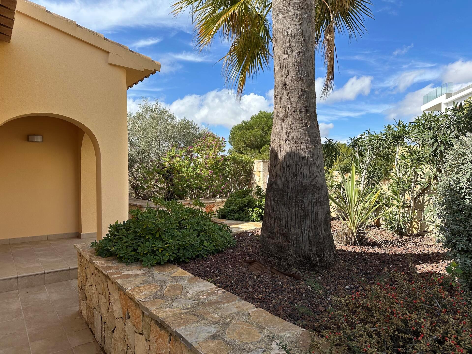 Large and comfortable villa with private pool in Benitachell, Costa Blanca, Spain for 6 persons. The house has 3 bedrooms and 2 bathrooms. The accommodation offers privacy, a lawned garden with trees, a beautiful pool, wonderful views of the sea and stunning views of the mountains. Its comfort and the proximity to the beach make this a fine villa to spend your holidays in Spain with family or friends.